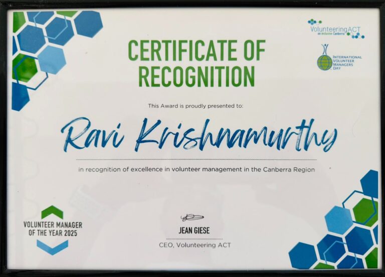 Volunteering ACT – Certificate of Recognition for Ravi Krishnamurthy