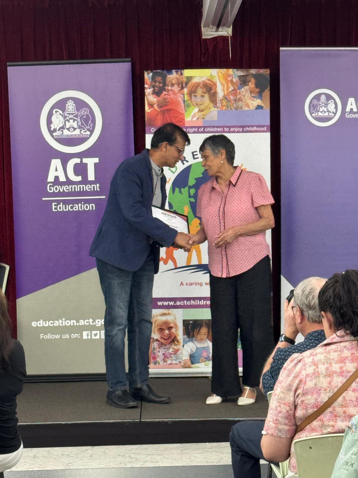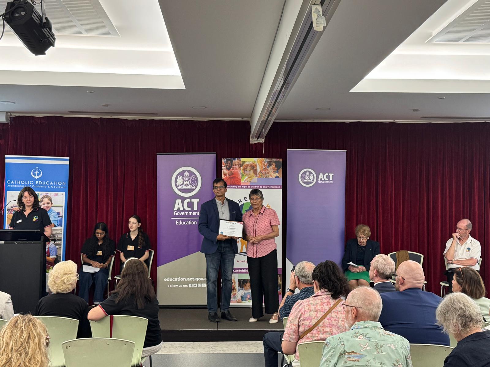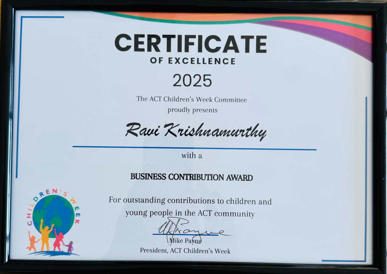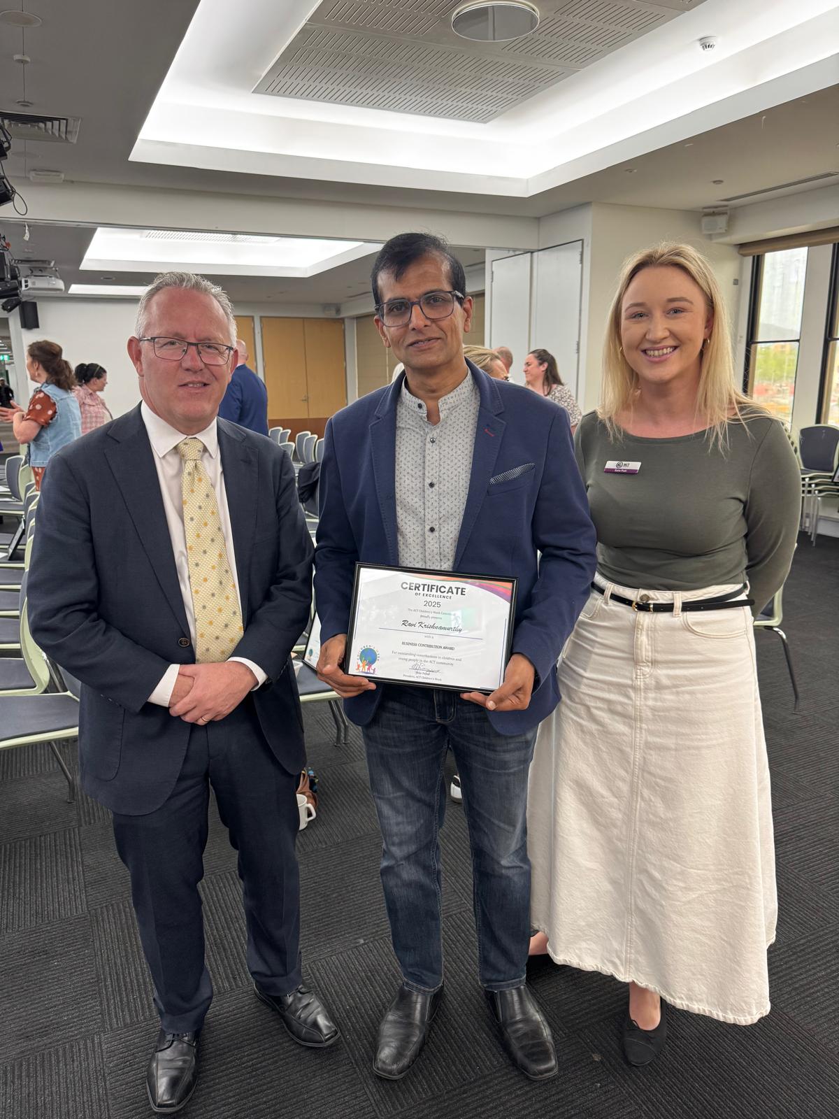 Ravi Krishnamurthy from AMAN ACT received the Business Contribution Award during the ACT Children’s Week 2025.